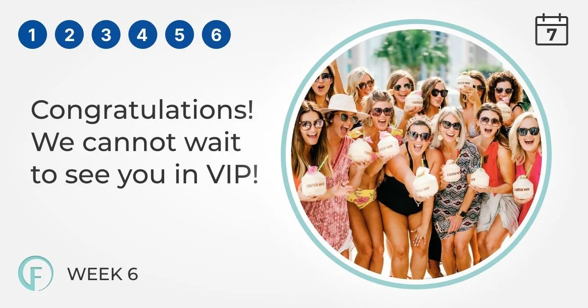 Vas a recibir tu membresía VIP automáticamente después de que acaben tus seis semanas. Después te llegarán más detalles sobre la orientación y te diré qué pasos siguen para empezar tu experiencia VIP.